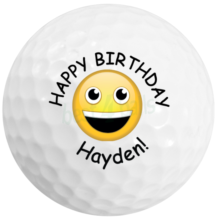 Copyright Declaration. In order to use a design on a golf ball you represent and warrant that: You are the owner of the content or the content is in the public domain. You have the legal right and authority to reproduce this design. You have no knowledge as to any third-party claims regarding the intellectual property. The content does not infringe the rights of privacy, celebrity, moral or other rights of any third party. The work is not defamatory or obscene. The content does not contain illegal material. Best4balls.com reserves the right to object to printing material that may be obscene or may conflict with this copyright declaration. We hope you will be pleased with our personalised service on Happy Birthday Smiley golf balls.