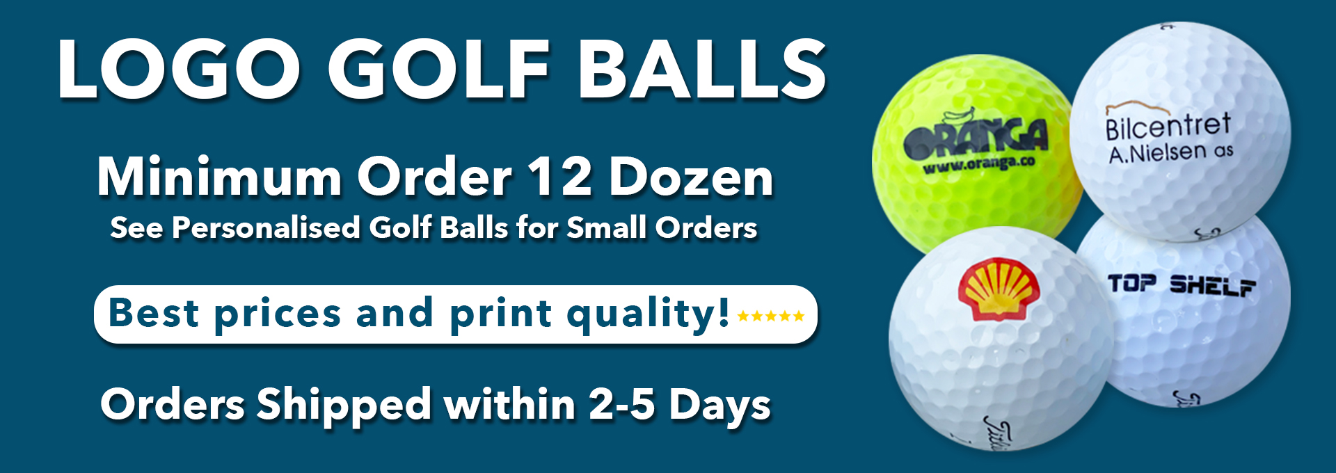 If you require less than 12 dozen golf balls please try our personalised golf balls service (minimum order 1 dozen). This service is ideal for small orders or complicated logos or photos, as we can print full colour onto any of our logo golf balls.