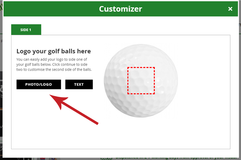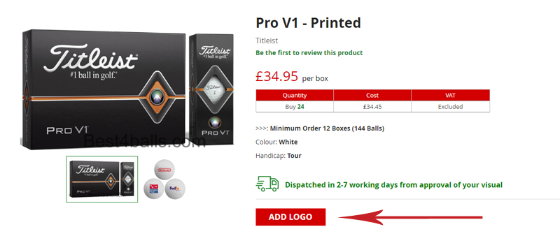 Select your required golf balls, these are listed by brand, budget or by occasion. Once you have selected your golf balls click the red 'Add logo' button.