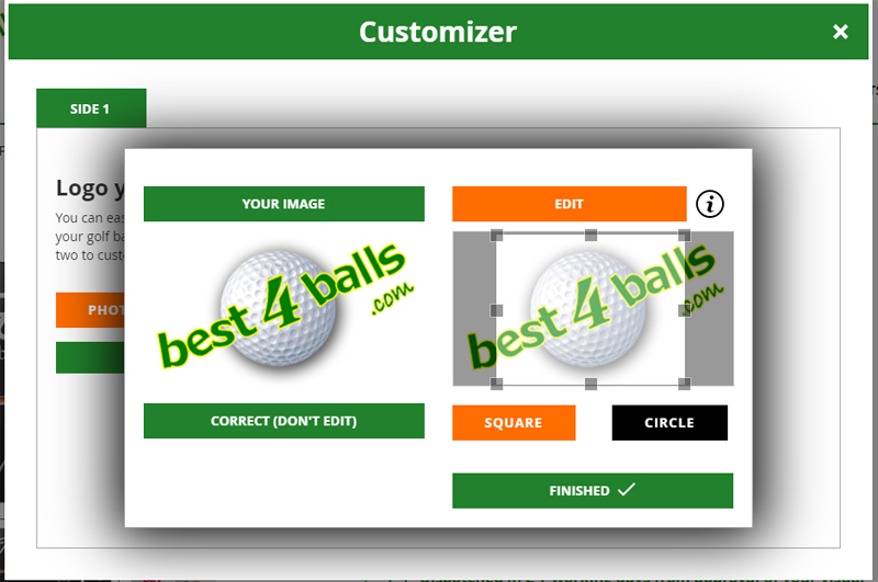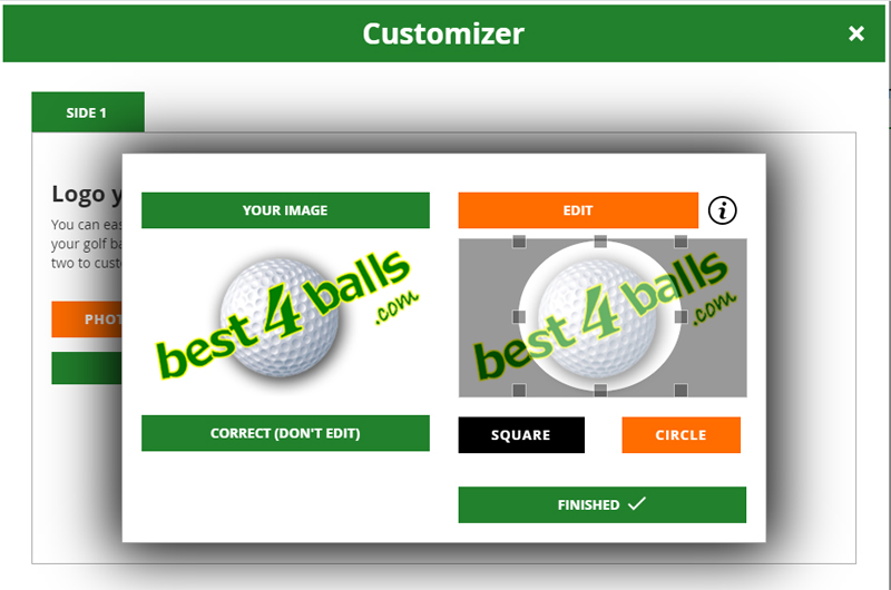 Once you image has uploaded you have the option to print exactly as it is (click 'Correct Don't Edit') or Edit. When you click edit you can crop your image into a circle or square, the light section within the circle/square is what you will see printed on the ball. Once you are happy with your image click finished.