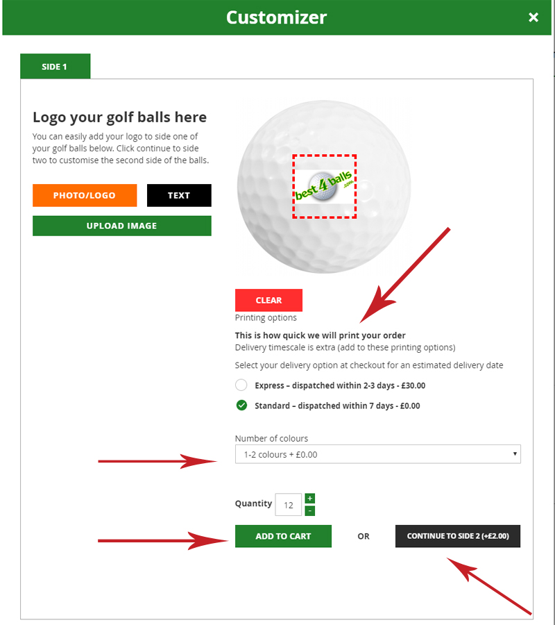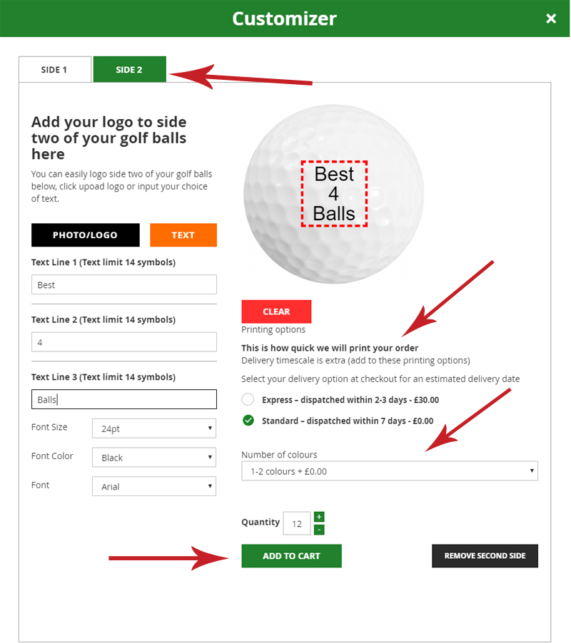 Using the above process select your printing option and insert your chosen text/logo (the green tab at the top of the screen shows which side of the ball you are working on and you can switch between sides). Once you are happy with your on screen visual check the printing options section under on the on visual. This automatically defaults to our standard 5-7 working days option, you 2-3 day print here and also amend the quantity of boxes of balls you require. Once this is done you can add to cart.