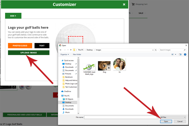 From here select the location of the photo/logo you want printed onto your golf balls find your file and click open. Ensure the logo you are uploading is in vector format, this will either be an ai or eps file.