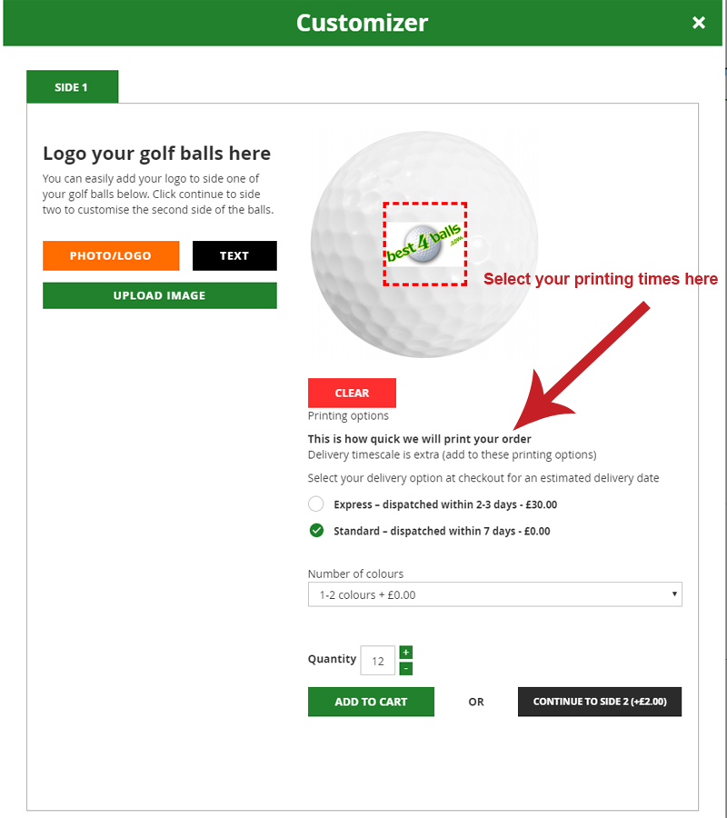 Step 1: Select your printing times on the golf balls customiser (see below)