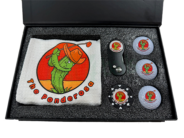 - This set come with 3 x logo printed golf balls, 1 x logo printed poker chip marker, 1 x logo printed switchblade pitchfork and 1 x embroidered golf towel.