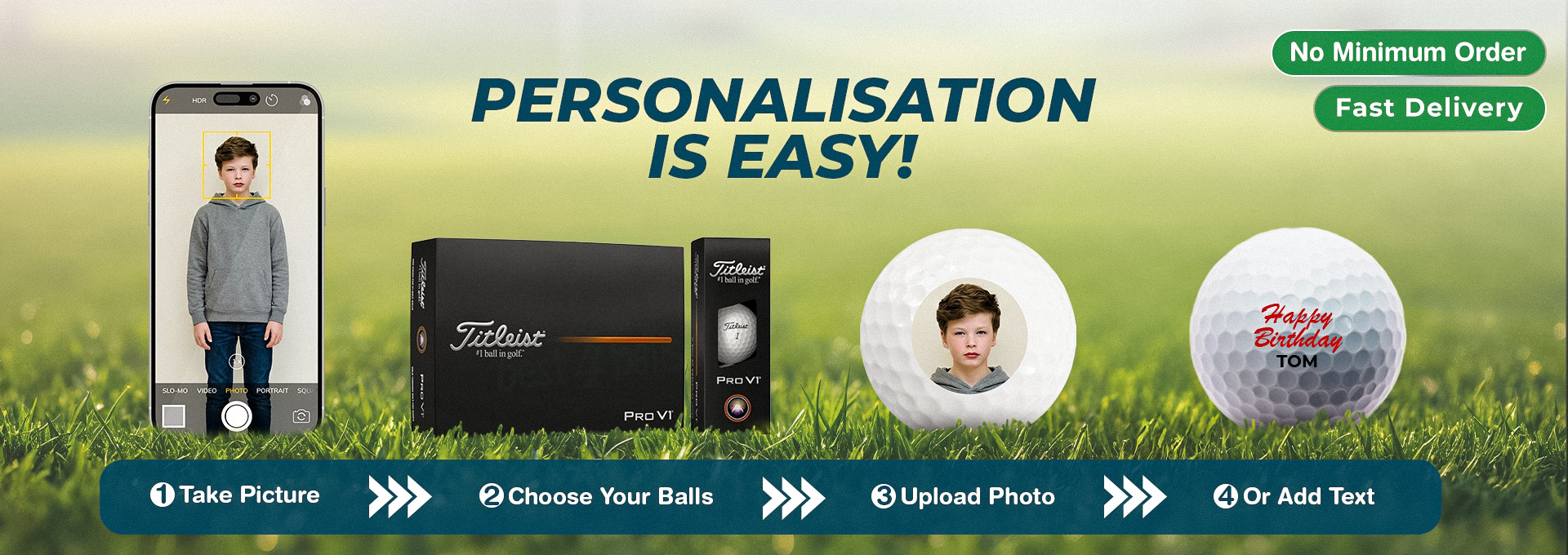 Personalised golf balls, printed with any photo, text or even logo! No minimum order quantity and choose from our huge range of branded or non-branded golf balls.