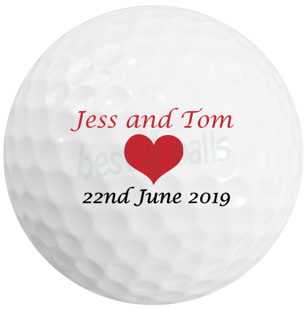 How to personalise your Anniversary Heart golf balls: Click the Red 'Personalise' button above, insert the names you require printing into Line 1 and the date in Line 2. An online visual will appear on the golf ball before you add to cart. We do not offer visual proofs before printing. The Anniversary Heart design will be printed to side one of your golf balls, the design of the ball is fixed, we will add your specified names and date only. Unfortunately we cannot accept any other message here.