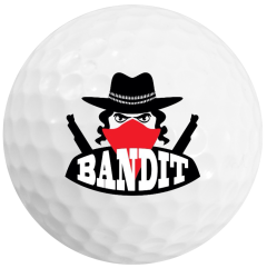 1. A single white golf ball printed with the image of a cowboy wearing a black had and two guns. Underneath is the text BANDIT