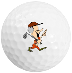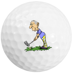 11. A single white golf ball printed with the cartoon image of an old male golfer on green grass with a putter and golf ball
