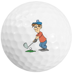 7. A single white golf ball printed with the cartoon image of a male golfer taking an iron shot.