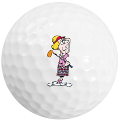 8. A cartoon image of a lady golfer holding a golf club printed on a single white golf ball