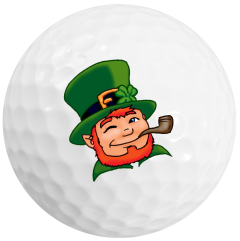 9. A single white golf ball printed with the image of a leprechaun wearing a green had and a pipe in his mouth