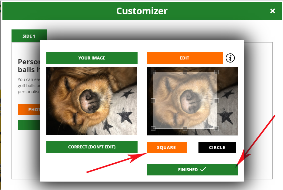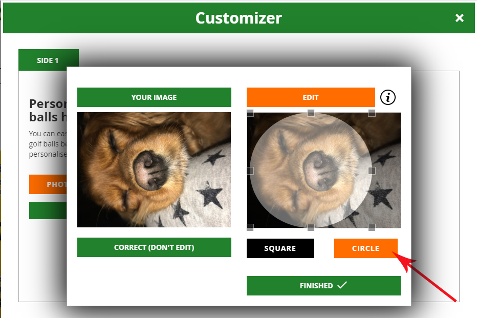 Once you image has uploaded you have the option to print exactly as it is (click 'Correct Don't Edit') or Edit. When you click edit you can crop your image into a circle or square, the light section within the circle/square is what you will see printed on the ball. Once you are happy with your image click finished.
