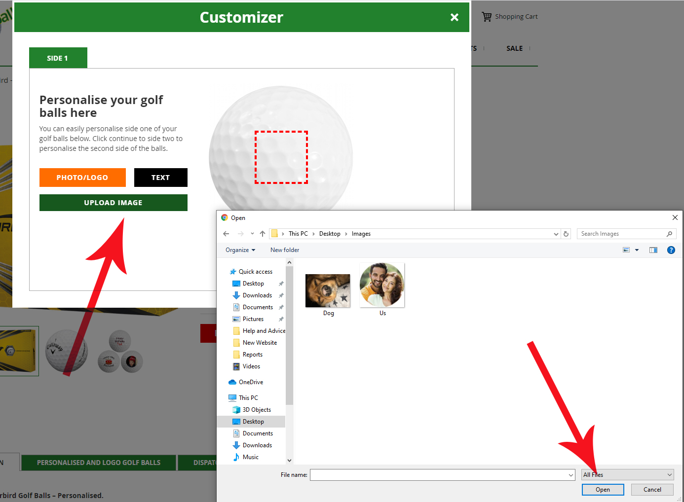 We can print any photo, logo or text for this option. Select the photo/logo button, and a black button will appear where you can upload your image. From here select the location of the photo/logo you want printed onto your golf balls find your file and click open.