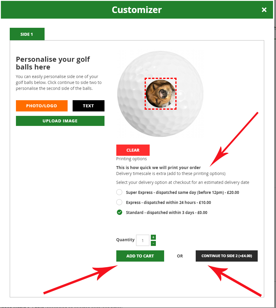 Use the continue to side 2 button to add the same or another image to the 2nd side of your golf balls using the same process.