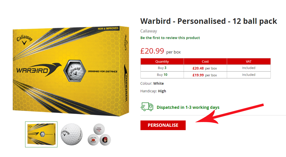 Choose your golf balls by brand, handicap, budget or occasion. Once you have chosen your golf balls click the red personalise button.