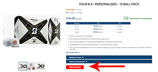 Choose your golf balls by brand, handicap, budget or occasion. Once you have chosen your golf balls click the red personalise button.