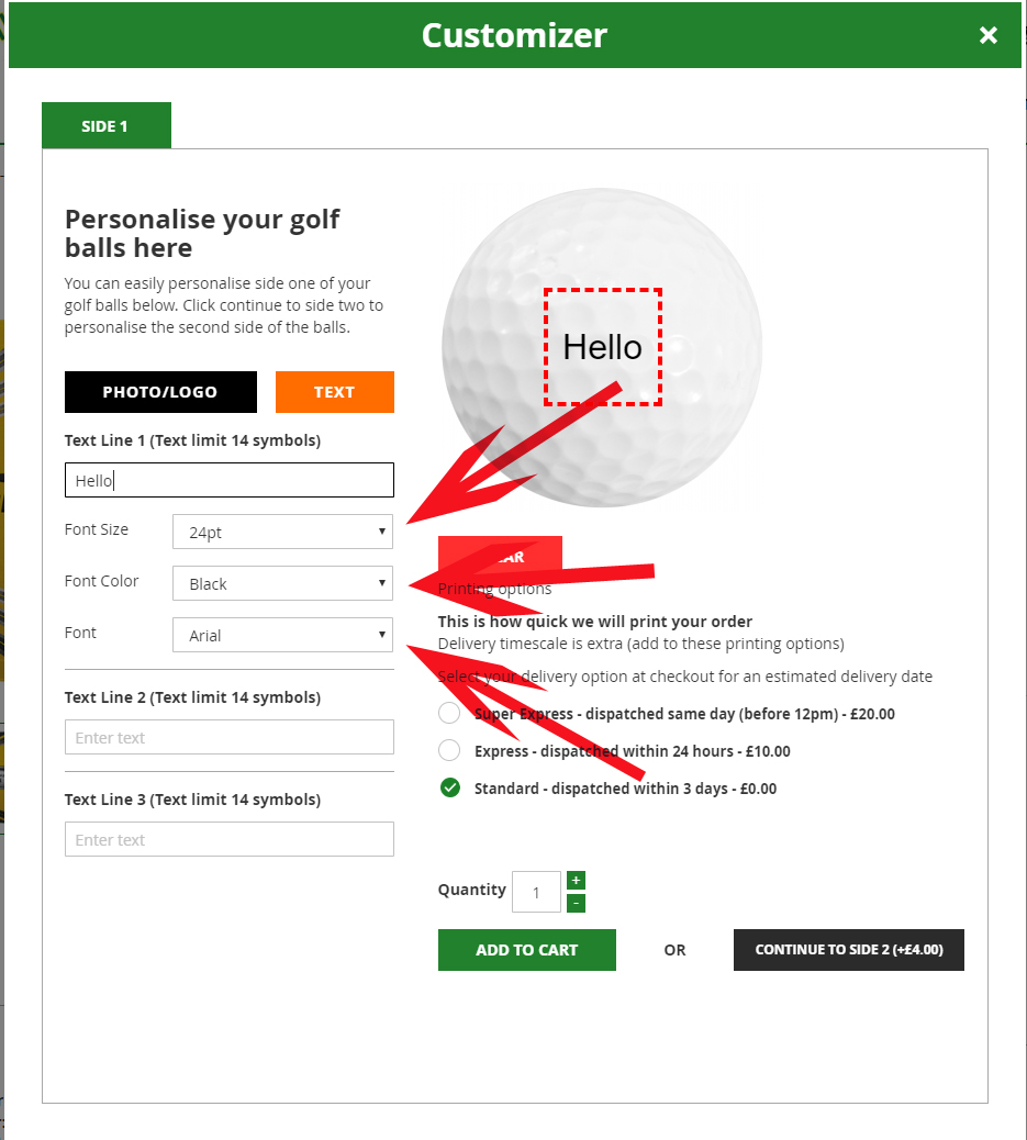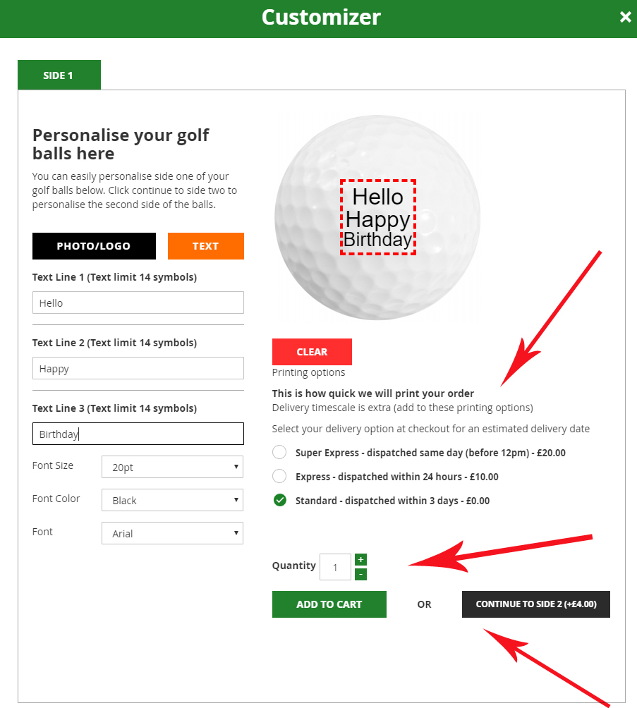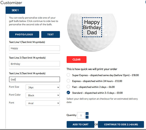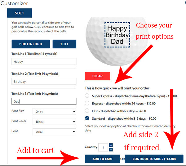 After inserting your text you will see your on screen visual, if you are happy with your personalisation check the printing options section. This automatically defaults to our standard 3-5 working days option, you can select a 2 working day, 24 hour or same day print option here and also amend the quantity of boxes of balls you require. Once this is done you can add to cart.