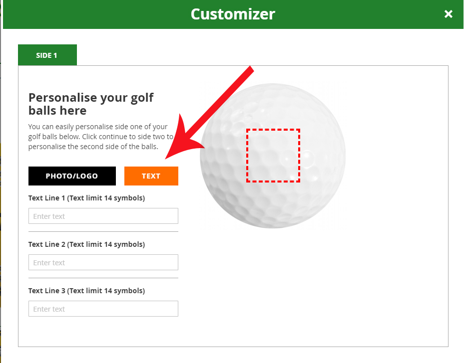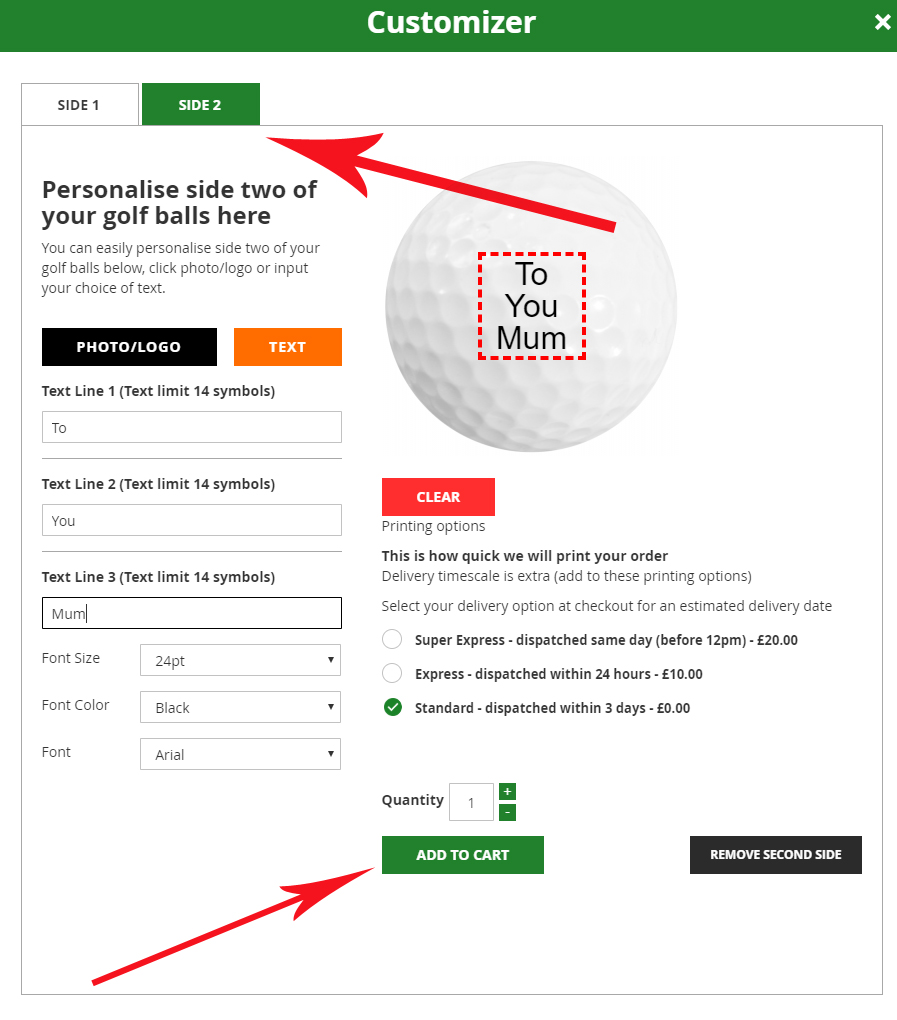 Use the continue to side 2 button to add more text or an image to the 2nd side of your golf balls using the same process.