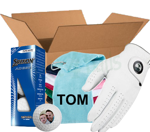 Great set of personalised sleeve of golf balls with printed glove and embroidered golf towel