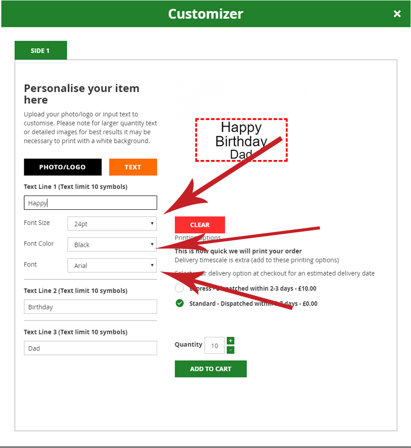 If you are happy with your personalisation and are ready to palce your order check the printing options section under the on screen visual. This automatically defaults to the standard 5-7 working days option, you can select an express 2-3 working day print here and also amend the quantity, the minimum quantity will be set in the quantity box. Once you are happy with all of this you can add to cart.