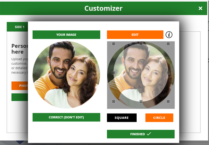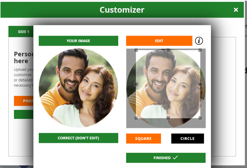 Once you image has uploaded you have the option to print exactly as it is (click 'Correct Don't Edit') or Edit. When you click edit you can crop your image into a circle or square, the light section within the circle/square is what you will see printed on the ball. Once you are happy with your image click finished.