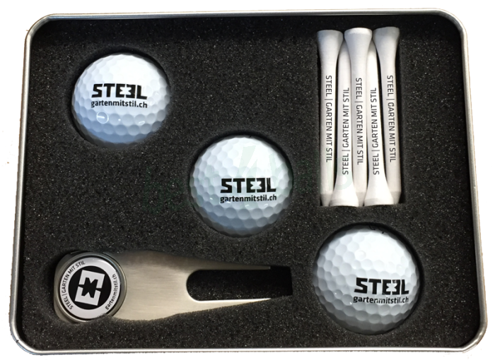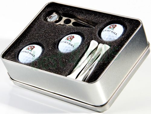 - This set comes with three logo printed non-branded golf balls, personalised wooden tees and personalised pitchfork.